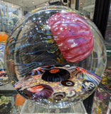 The Gold Ruby Jellyfish has a beautiful translucent fuchsia ribbed dome. Under the dome is a brown and gold band with an array of delicate, colorful and wispy floating tentacles. This sculpture is a beautiful Gold Ruby Jellyfish swimming over an enchanting sea bottom covered in, algae, barnacles and sea anemones.
